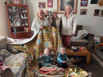 On a cold, sunny day the Quilting Sisters visited Susan to present not only her with a quilt, but Mila and Myla as well. The gleeful girls wrapped themselves in their quilts to pose briefly for a photo and then were off and running again.