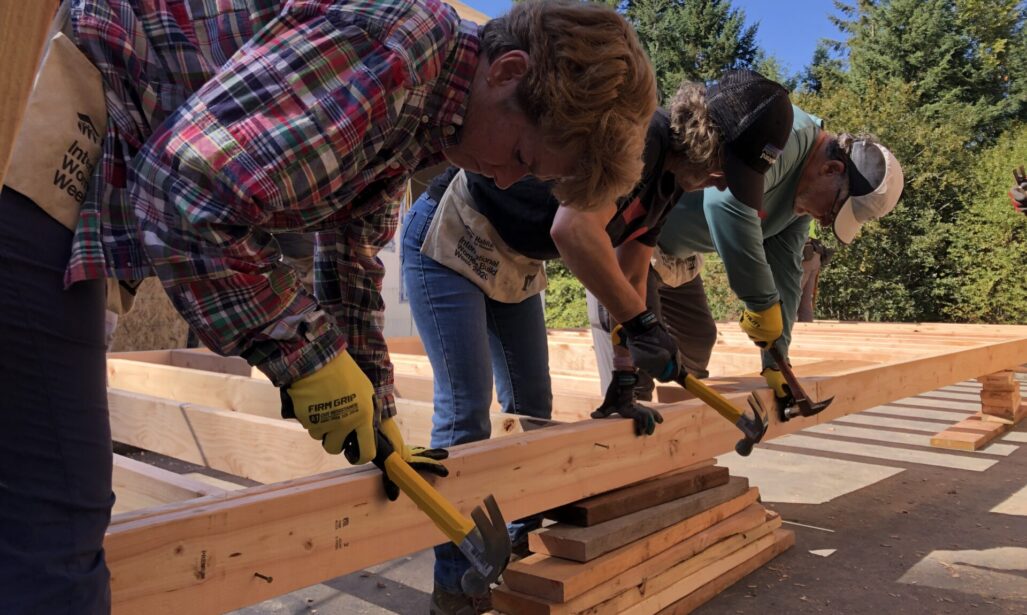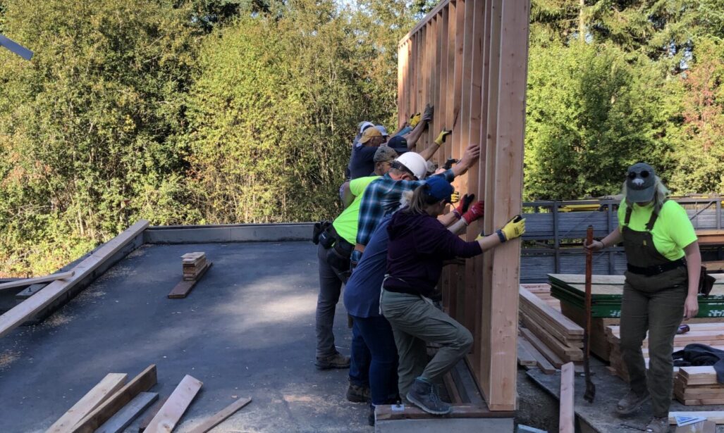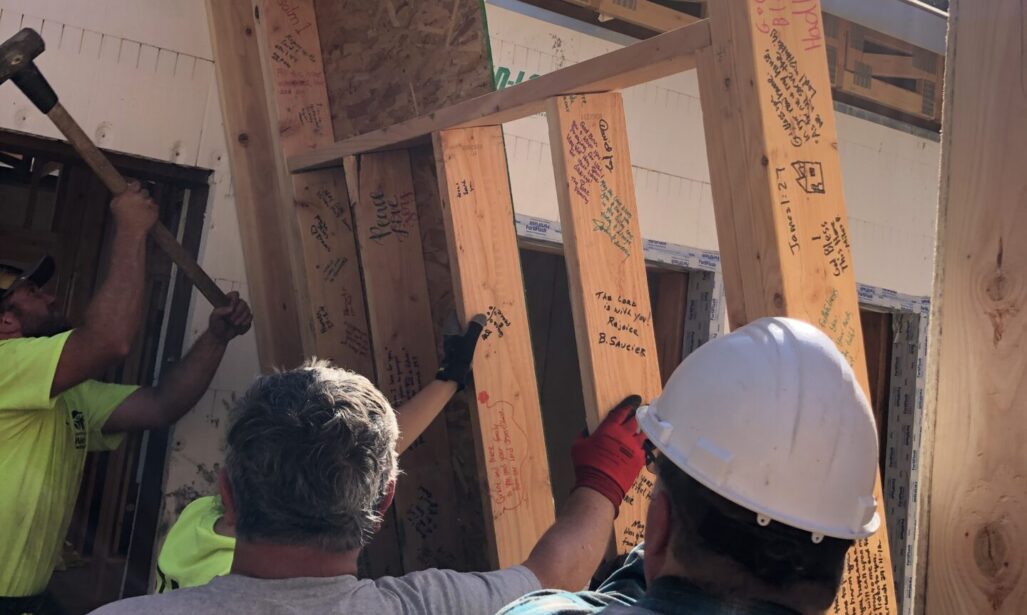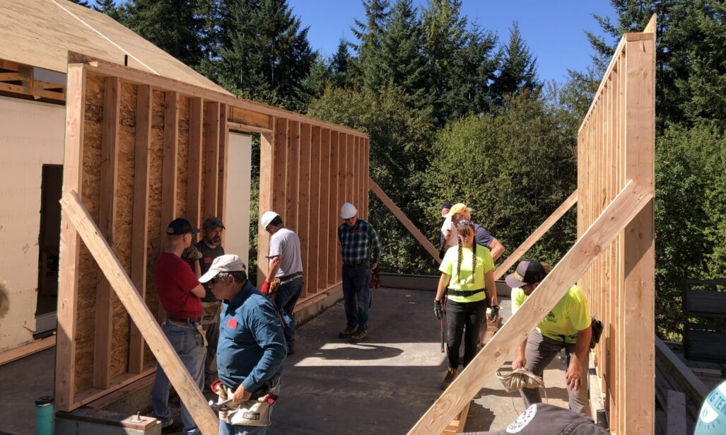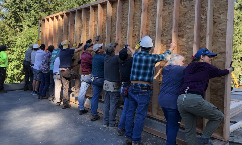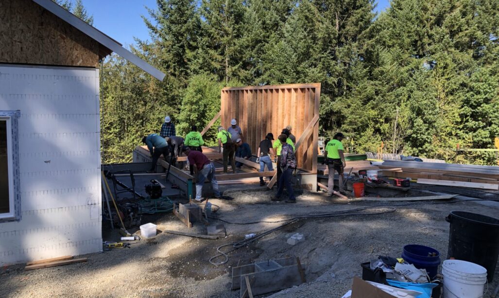 For the first time in more than a decade, Tacoma Habitat is building across the Narrows. Construction at our three-home Canterwood project has been ongoing, using the innovative and sustainable practice of ICF framing. But on September 9, the first wooden walls were raised, framing the garage and breezeway of the Building on Faith home, lovingly sponsored by Chapel Hill Church. Future homeowner Kris was on site, glad to see progress on his family’s forever home.