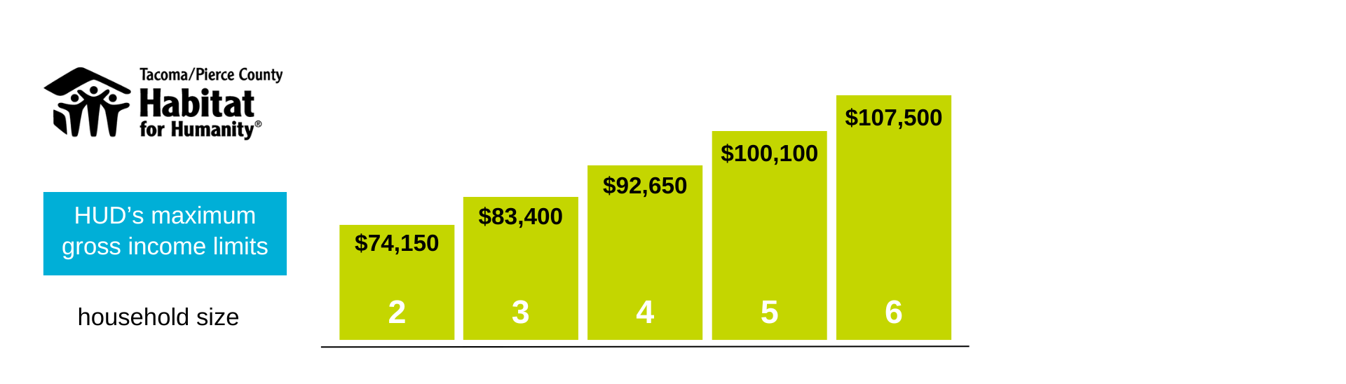 Tacoma/Pierce County Habitat for Humanity’s homebuyer program is designed for households with a maximum gross income* (before taxes) of 80% of Area Median Income, based on household size (all individuals living in the household).