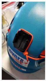 You are  welcome to bring a GoPro (or other like model camera) to wear during your descent. Your camera must have a sliding clip so it can be mounted to the Over the Edge (OTE) helmets. (Some helmets will already have the adhesive receiver mounted; see photo, left.)
